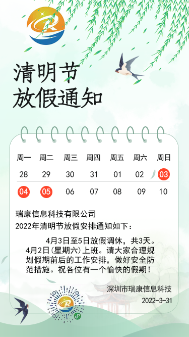 2022年4月3日到2022年4月5日放假,2022年4月2日(周六)正常上班。