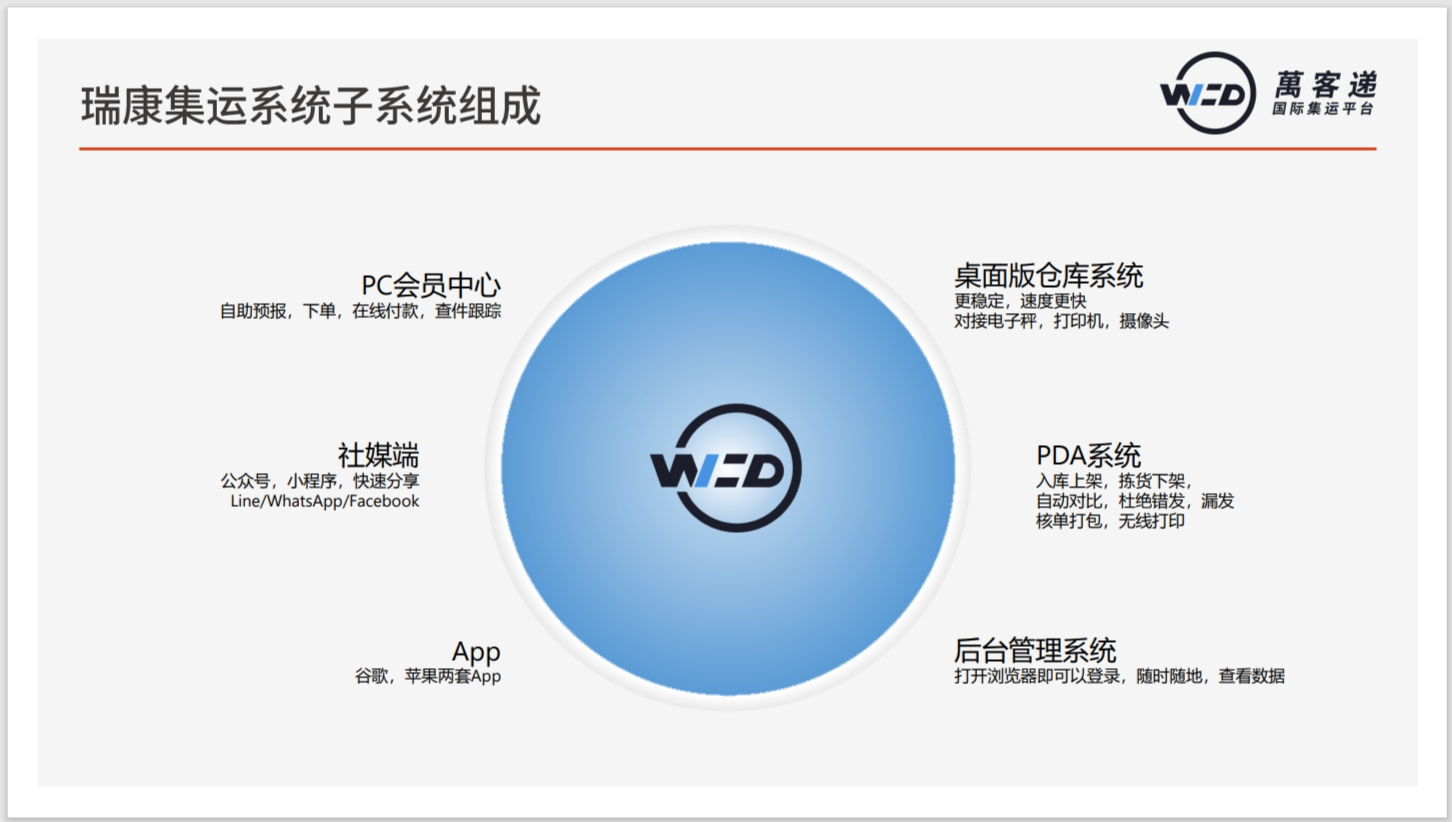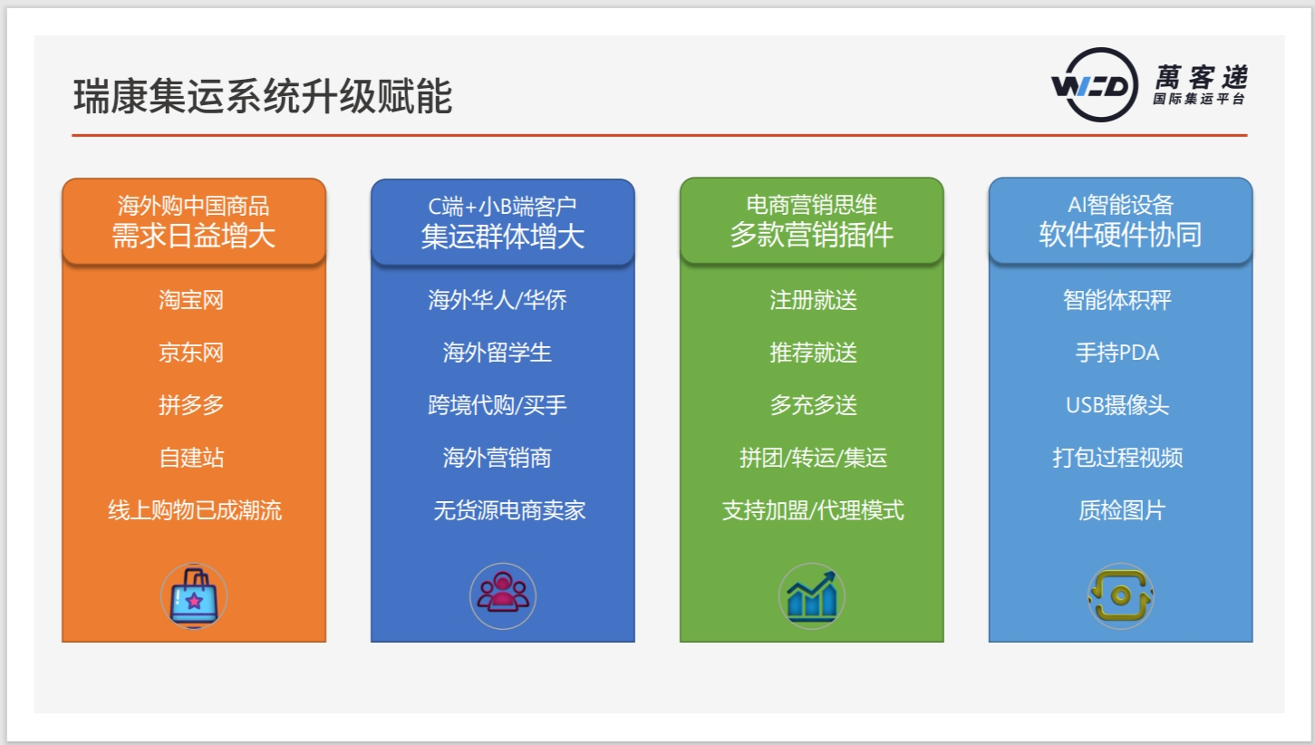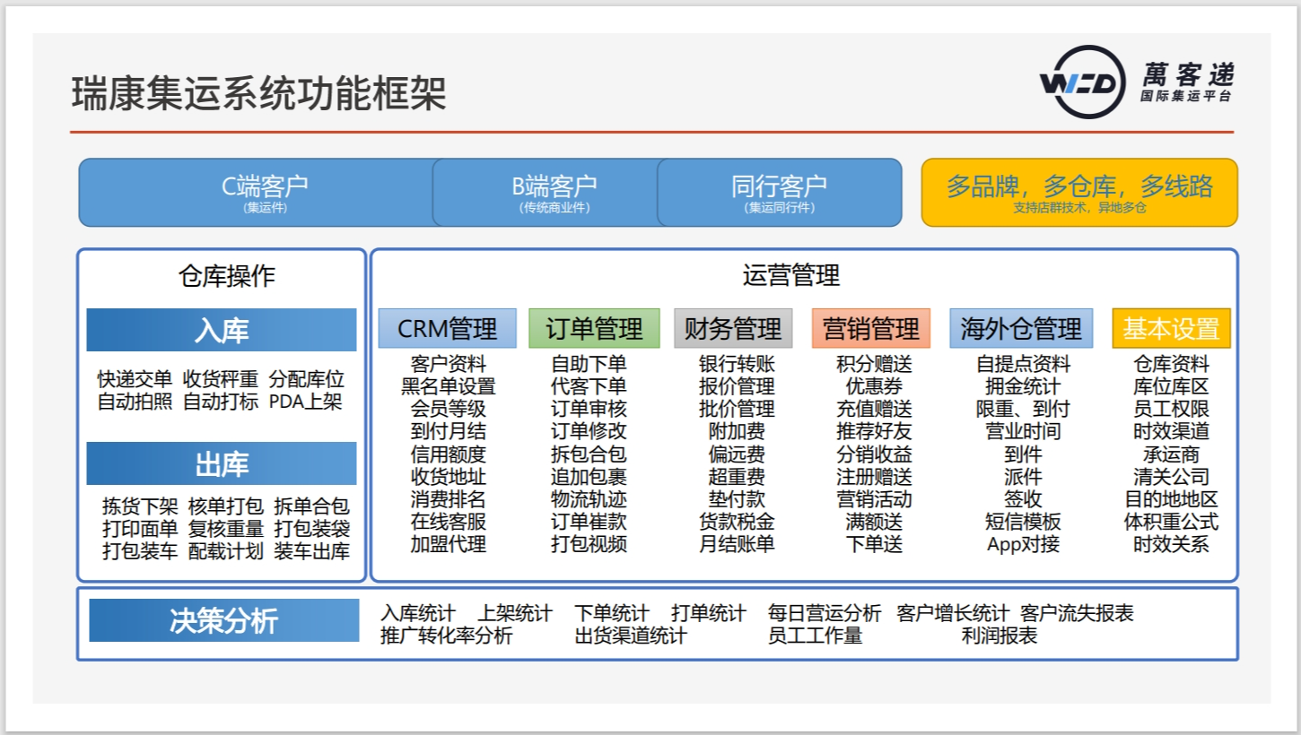 瑞康集運系統是專門為跨境集運服務商設計研發的集訂單管理、會員管理、財務管理、倉儲管理為一體的信息化系統。